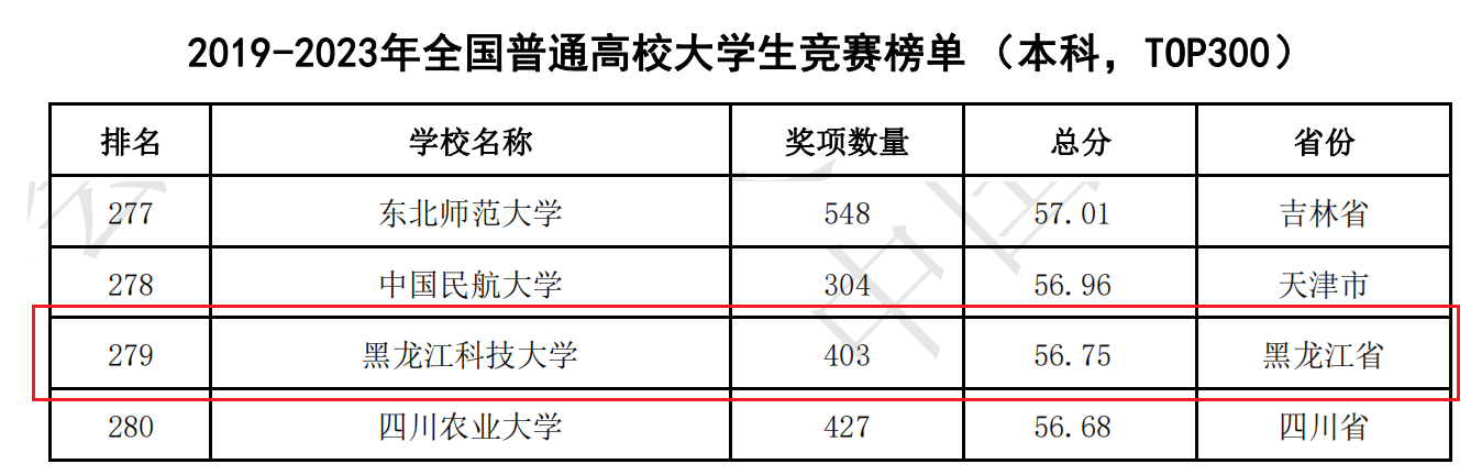 全国共有1218所本科院校纳入《分析报告》。乐鱼网站_乐鱼(中国)在《全国普通高校大学生竞赛八轮总榜单(本科,TOP300)》中,位列第287,较去年该榜单提升11位;在《2019-2023全国普通高校大学生竞赛榜单(本科,TOP300)》中,位列第279,较去年该榜单提升超过21位,在全省高校位列第6名(我省排名前6的高校为:哈尔滨工业大学、哈尔滨工程大学、东北林业大学、哈尔滨理工大学、东北石油大学、乐鱼网站_乐鱼(中国));在2023年单年全国大学生竞赛排名第180位,较去年提升97位。