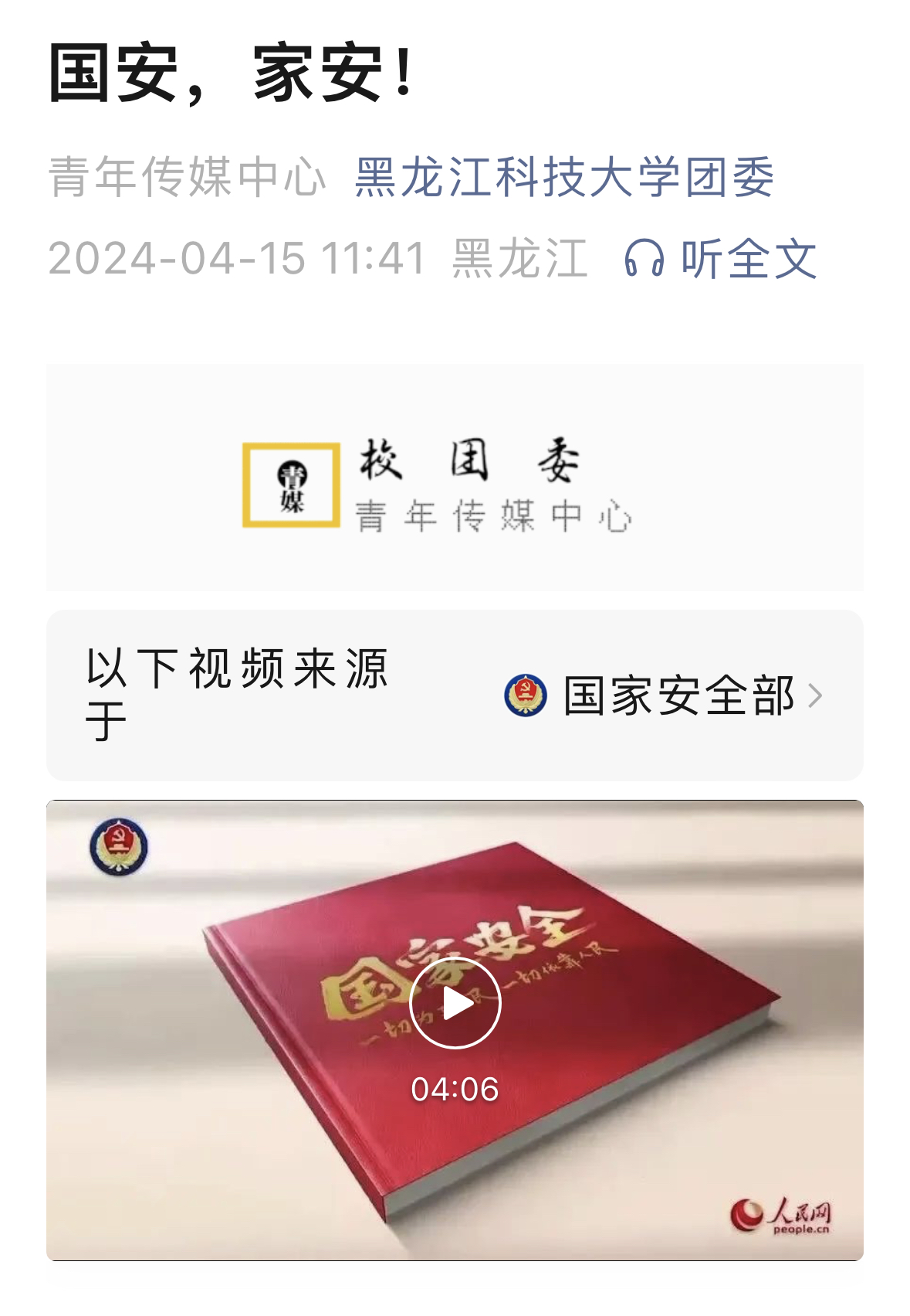 多形式进行仪式感召。4月15日,乐鱼网站_乐鱼(中国)组织开展“国家安全、青春挺膺”主题升旗仪式,学工部、校团委负责人,部分团学干部,校院两级学生组织代表1000余人参加了升旗仪式。活动中,全体师生观看了全民国家安全教育日宣传短片,校学生会团支部代表李羿飞、陈浩代表全校青年学生作了题为《国家安全、人人有责》的演讲,大家纷纷表示要做维护国家利益的忠诚捍卫者、国家安全的坚定守护者,共同建设和谐美丽,安全稳定的乐鱼网站_乐鱼(中国)校园。4月12日,校学生会团支部、第十五期“青马工程”骨干培训班团支部赴哈尔滨音乐学院参加了“国家安全、青春挺膺”省级示范团日活动,大家纷纷表示通过理论学习和音乐鉴赏相结合的新模式,深刻感悟了总体国家安全观的磅礴伟力。