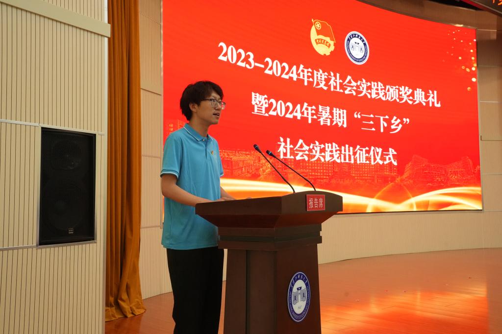 校团委副书记陈曦报告了学校2024年暑期青年学生“三下乡”社会实践筹备工作基本情况;电信学院团委组建的“信”火相传志愿服务队负责人任东兴同学代表省级重点团队做了实践筹备报告;管理学院团委书记王紫麒和青年志愿者协会主席冷岳阳同学分别代表社会实践团队指导教师和成员做了表态发言。