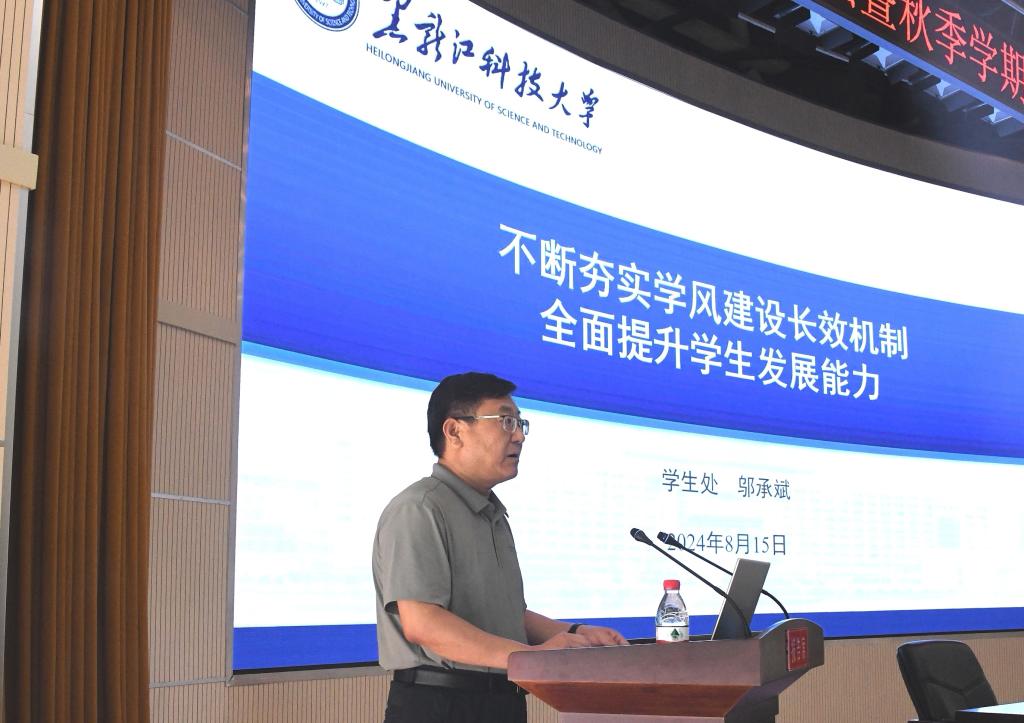 校党委书记周宏力以全局的视野,简要总结了上学期以及暑期以来,学校各战线取得的成绩和存在的短板。并强调,要进一步提高政治站位,深入学习宣传贯彻党的二十届三中全会精神和省委十三届六次全会精神,切实将思想和行动统一到党中央和省委决策部署上来,更加深刻领悟“两个确立”的决定性意义,增强坚决做到“两个维护”的思想自觉政治自觉行动自觉,坚守“身在最北方、心向党中央”的政治忠诚,坚定不移把全面深化改革推向前进。要进一步深化能力作风建设,在能力本领上再提升、在转变作风上再聚焦、在工作落实上再用力,用更宏阔的胸怀和视野谋划思路、推动工作,一锤接着一锤敲、一年接着一年干、一代接着一代干,脚踏实地把既定的行动纲领、战略目标、工作蓝图变为现实。要进一步坚定信心信念,以饱满的工作热情、良好的精神状态,担当作为、真抓实干,全力以赴做好本学期各项重点任务,奋力推进学校各项事业高质量发展再获新突破、再上新台阶,以优异成绩和崭新气象迎接中华人民共和国成立75周年。