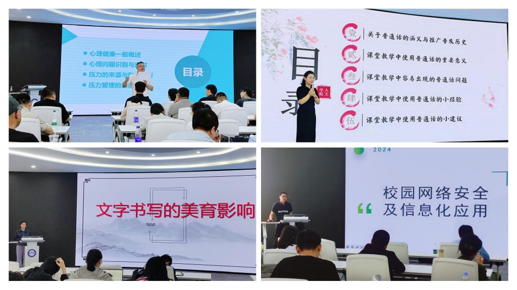 在专业技能培训中,管理学院书记何景洋以“心理健康与压力管理”为题,帮助新入职教师更好地理解和应对各种心理问题和挑战。信息网络中心副主任王建才以“校园网络安全及信息化应用”为题,帮助新入职教师掌握与其生活息息相关的校园网络安全及信息化应用知识。人文社会科学学院教师李璐以“架起师生间沟通桥梁——让普通话不再普通”为题,倡导新入职教师要多渠道、广角度、全方位阅读经典,感受语言文字之美,提升表达能力。建筑工程学院教师薛冰以“文字书写的美育影响”为题,强调规范的板书书写不但有利于提升教师自身的专业素养,更能引领带动学生的审美情趣和鉴赏能力。