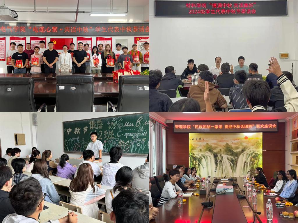 电气学院邀请家庭经济困难学生代表参加“电连心聚·共话中秋”学生代表中秋茶话会,通过发放暖心礼包、解答资助政策等方式,提升困难学生帮扶实效。材料学院、人文学院、外国语学院开展新生中秋节茶话会,给新生营造团圆、和美的节日氛围,缓解新生思乡之情。管理学院开展“民族团结一家亲,喜迎中秋话团圆”联欢座谈会,少数民族学生通过表演具有异域特色的歌舞诠释了中华民族共同体意识的丰富内涵,展现了民族文化融合的完美画卷。