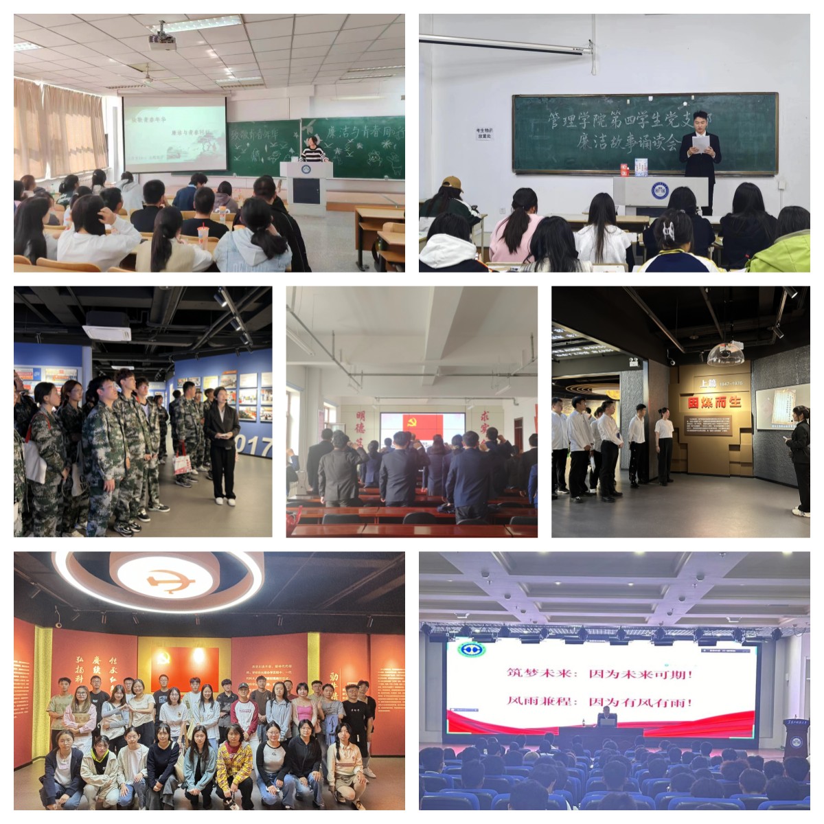 开展“致敬青春年华,廉洁与青春同行”宣传教育活动。人文学院党委在青年学生中开展了“致青春年华,廉洁与青春同行”主题班会。管理学院党委各团学组织开展了廉洁文化书画作品展、学生会开展了以“致敬峥嵘岁月,永葆清廉本色”为主题的演讲比赛、各党支部开展了廉洁故事诵读会。经济学院党委、马克思学院党委组织2024级新生参观校史馆,上好廉洁“第一课”。电信学院、研究生学院党支部组织开展了主题党日活动,引导师生筑牢政治忠诚、严守纪律红线,以更加饱满的热情,更加昂扬的斗志投入到当前迎评促建等重点工作中去,奋力谱写学院发展新篇章。机械学院党委书记吕刚为学院2024级全体学生作了题为《筑梦未来,风雨兼程》专题讲座,教育学生要坚守底线思维,主动在思想上画出红线、在行为上明确界限,不能逾越“政治的底线”“道德的底线”“法律的底线”和“学业的底线”。