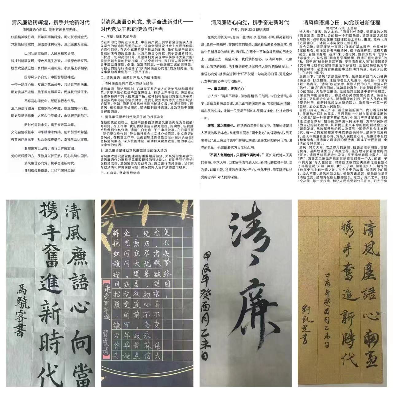 开展“清风廉语心向党,携手奋进新时代”校园征文活动。各单位党组织组织师生结合工作、学习、生活实际,撰写诗歌、散文、随笔、信件等,记录和展现新时代廉洁勤政新风尚,特别是在“迎评”工作中涌现的先进个人事迹,教职工和青年学生通过构思文章,将廉洁入心入脑,一字一句话廉洁,一笔一画书廉心。