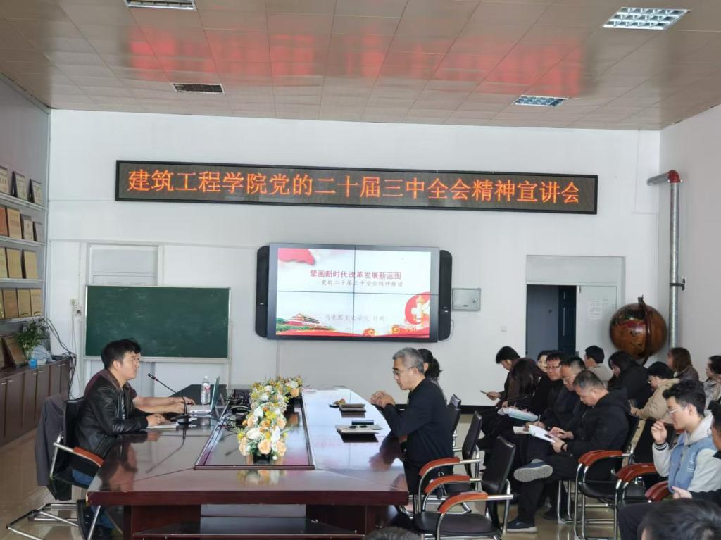 10月15日下午,建筑工程学院组织召开了学习贯彻党的二十届三中全会精神宣讲会。宣讲会由学校宣讲团成员、马克思主义学院副院长付明主讲,学院党委书记高宝全主持。付明在全面解析全会召开的背景、重大意义、核心内容以及改革原则与方向的基础上,通过深入浅出的讲解和丰富的案例,详细阐述了中国式现代化为什么、是什么、怎么办的问题。同时,结合个人的工作经历,分享了学习的心得体会。