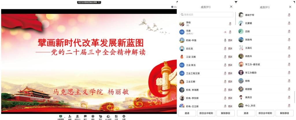 10月11日晚上,机械工程学院举行了党的二十届三中全会精神宣讲会暨教职工政治理论学习会议。学校宣讲团成员、马克思主义学院教师杨丽敏作了主题宣讲。宣讲会以线上形式进行。学院全体教职工参加了宣讲会。宣讲会由副处级辅导员毕强主持。杨丽敏老师以《擘画新时代改革发展新蓝图》为题,围绕党的二十届三中全会的召开背景、重大意义、重点内容及如何把握“深化改革”的正确方向作了宣讲。