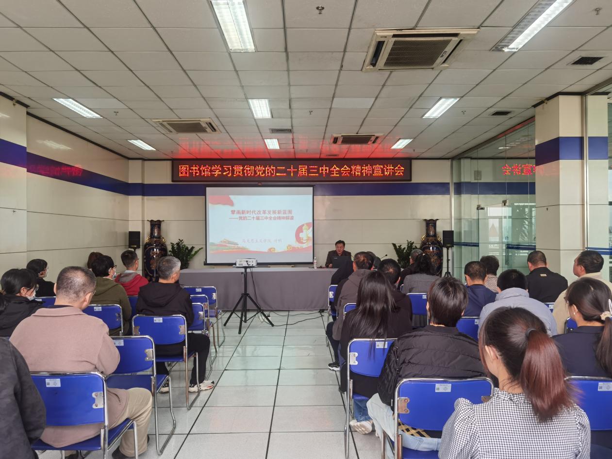 10月16日下午,图书馆召开学习贯彻党的二十届三中全会精神宣讲会。此次宣讲会邀请了学校宣讲团成员、马克思主义学院副院长付明作宣讲报告。会议由图书馆党总支书记郭明良主持,图书馆全体职工参加了会议。付明从党的二十届三中全会召开背景及重大意义、深刻把握党的二十届三中全会的重点内容、坚持“六大原则”牢牢把握改革正确方向三个方面对党的二十届三中全会精神进行了系统的解读。