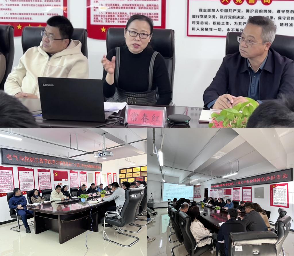 10月8日,电气与控制工程学院在朝阳楼0607会议室采取线上与线下相结合的方式召开了学习贯彻党的二十届三中全会精神宣讲报告会,邀请了学校宣讲团成员、马克思主义学院教师常春红进行理论宣讲。会议由党委书记李鹏银主持。常春红以“擘画新时代改革发展新蓝图——党的二十届三中全会精神解读”为题,从三个方面全面、深入、系统地进行了阐述。