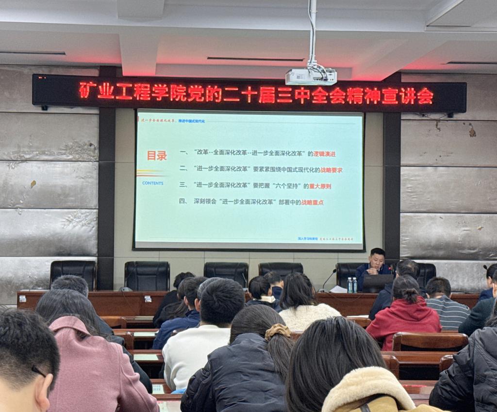 11月5日,矿业工程学院召开了党的二十届三中全会精神宣讲会。邀请学校宣讲团成员、马克思主义学院教师庄得宝作专题宣讲。学院全体教职工参加会议。庄得宝从四个方面对学习贯彻全会精神的重大意义进行分析阐释。宣讲报告的思想内容实、分析讲解透,注重运用生动事实与典型事例,有效提升了全院教职工学习贯彻全会精神的思想自觉、政治自觉和行动自觉。
