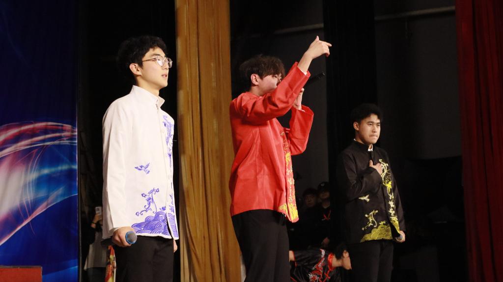 历史洪钟,敲响往昔岁月惊涛骇浪,时代明镜,映照今日校园壮志豪情,飞跃之声的同学们带来的诗朗诵《强国有我,青春担当》,他们以声音为笔、情感为墨,用青春的姿态发出新时代青年的奋进之音;由计算机学院物联22-3班魏树巍和电气学院电气24-2班刘闯共同演唱的歌曲《千山万水》,展现了中华民族在困难与挑战面前勇往直前、追求卓越的精神风貌,激发同学们为实现中国式现代化挺膺担当;大学生合唱团演唱的歌曲《有我》《紫荆花盛开》,这是青春向祖国的告白,句句彰显着青年学子的拳拳爱国之心。
