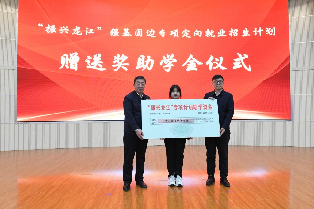 北大荒农垦集团有限公司党委委员、副总经理任淑兰,黑龙江八一农垦大学党委书记解宗军,黑龙江八一农垦大学2024级农学专业“强基固边班”学生董濡闻为代表,现场签署了“振兴龙江”强基固边专项定向就业招生三方协议;龙江森工集团党委副书记、总经理、副董事长王齐丰和省教育厅党组成员、省招生考试院院长李石共同向项目学生代表黑龙江工程学院高悦洋同学发放了学费和住宿费。