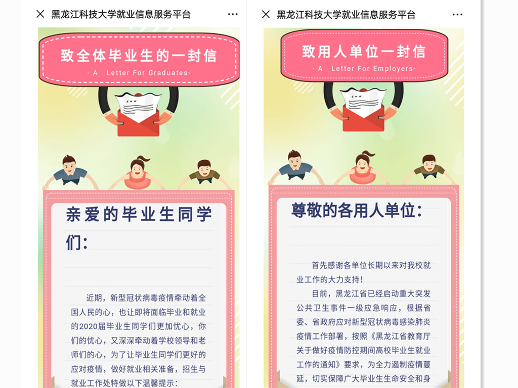 学校党委统筹部署疫情防控和毕业生就业工作,认真贯彻落实上级有关要求,主要校领导和主管校领导靠前指挥,带头落实就业工作“一把手”工程和“全员就业责任制”,严格执行校、院两级就业工作服务体系以及“就业职能部门-辅导员-班主任”与“院-系-导师”之间“双轨三线”立体交叉网格化工作模式,积极开展线上服务,确保疫情防控期间就业工作不断线。学校研究制定了《乐鱼网站_乐鱼(中国)疫情防控期间毕业生就业工作方案》,进一步完善了就业工作措施,细化了就业工作责任,为特殊时期开展毕业生就业工作提供了思路,明确了要求,找准了方向。招生与就业工作处及时发布了《致全体毕业生的一封信》和《致用人单位的一封信》,暂停现场招聘,开启线上招聘,持续开展毕业生就业服务和用人单位咨询服务。