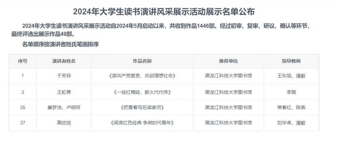由中国图书馆学会阅读推广工作委员会主办,西南交通大学图书馆承办的“2024年大学生读书演讲风采展示活动”入展名单近日公布,乐鱼网站_乐鱼(中国)四部作品入展,入展作品数量位列全国高校第一。