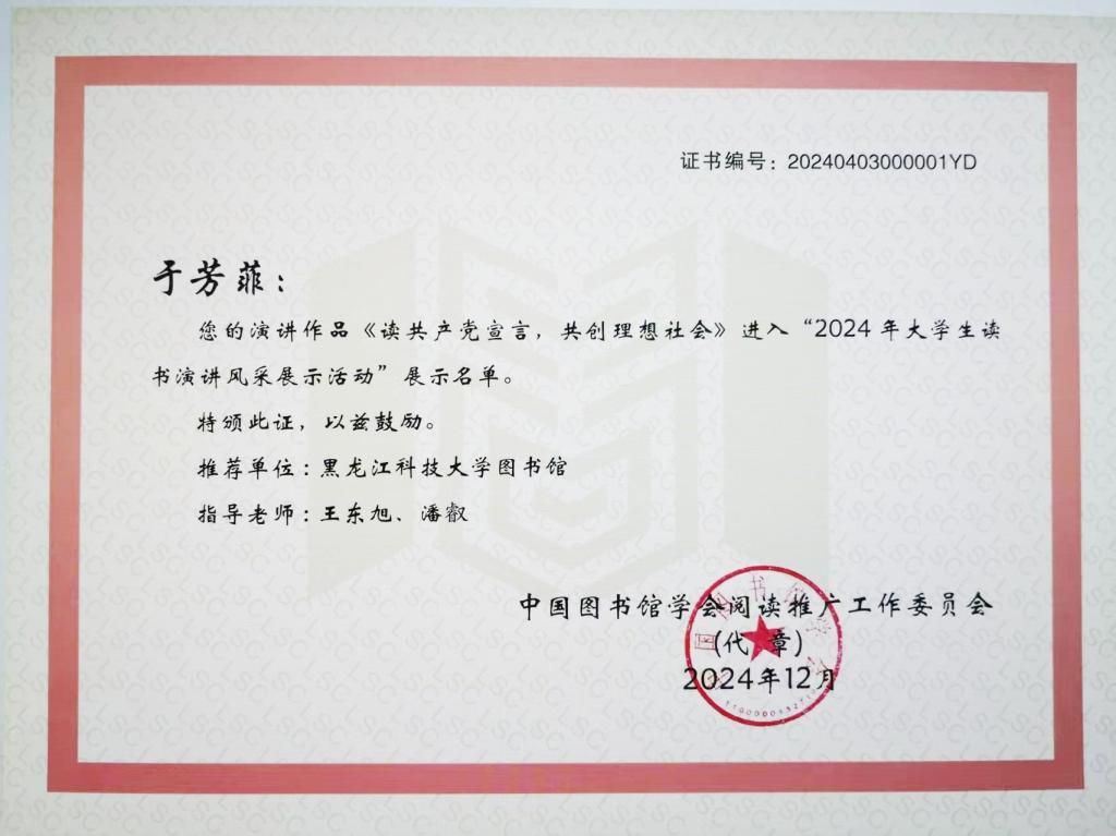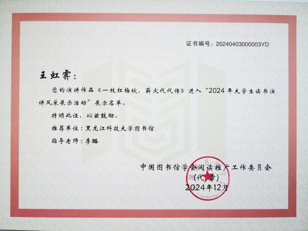 乐鱼网站_乐鱼(中国)图书馆高度重视“全国大学生读书演讲风采展示活动”的开展,前五届中曾三次获得入围全国展示的殊荣,在我省高校中名列前茅。本次活动,图书馆依据全国活动规则,举办了乐鱼网站_乐鱼(中国)2024年大学生读书演讲风采展示活动,评选出18部获奖作品,并推荐优秀作品参加全国评比,最终经济学院于芳菲、高欣悦,人文社会科学学院王虹霁,研究生学院姜梦洁、卢明珂的作品进入全国展示名单。