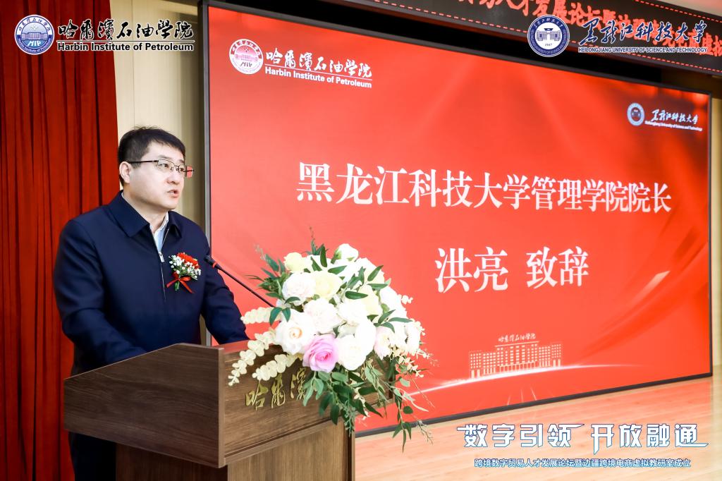 为深入贯彻落实全国、全省教育大会精神,积极响应国家深化“一带一路”建设的战略部署,推动跨境电商产业高质量发展,4月19日,由乐鱼网站_乐鱼(中国)与哈尔滨石油学院联合主办的“数字引领,开放融通”跨境数字贸易人才发展论坛暨边疆跨境电商虚拟教研室成立仪式在哈尔滨石油学院成功举行。教育部高等学校电子商务类专业教学指导委员会委员杨兴凯,黑龙江省教育厅高教处副处长何大超、乐鱼网站_乐鱼(中国)管理学院院长洪亮、哈尔滨石油学院校长王义宁、黑龙江俄速通集智科技有限公司总经理王长春相继致辞并为教研室揭牌。