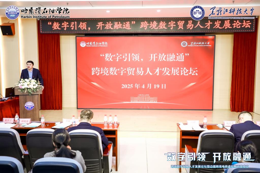 同日下午,“数字引领,开放融通”跨境数字贸易人才发展论坛在哈尔滨石油学院拉开帷幕。论坛上,专家学者直面数字贸易人才培养的痛点与机遇纷纷建言献策。教育部电子商务教指委委员杨兴凯教授强调,虚拟教研室通过“云端+线下”联动,可破解跨境数字贸易教育难题;黑龙江大学王金亮教授强调中俄合作需以文化互通为基,呼吁增设俄语数字贸易课程;长春财经学院常颖教授提出产教融合需实战驱动,校企共建模拟系统提升人才适配度;东北林业大学胡艳英教授以数据论证数字经济对黑龙江产业转型的赋能,建议加速数字基建布局;哈尔滨石油学院任洪云教授分享现代产业学院经验,通过实训基地与科研共研实现校企需求“零距离”对接。
