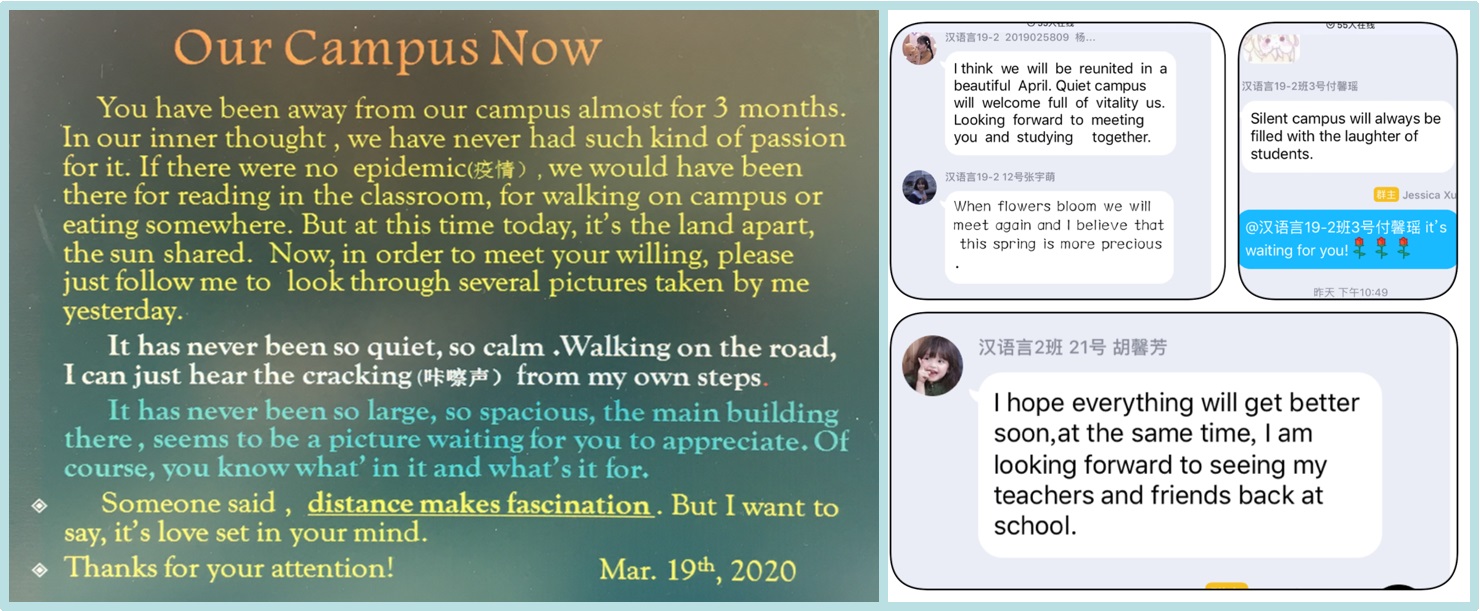 1.公外教师潜心线上教学,教学内容丰富有新意。受疫情影响,按各学院需求,外国语学院在教务处的指导下,调整了部分公共外语的教学计划,推敲研判确定大学外语QQ、MOOC和Welearn线上平台三维空间教室。各位教研室主任们组成团队,率先进行技术学习,模拟课堂,演练网络授课。教师通过观摩教研室主任在平台示范演练后,分组进行操作实践。教师们反复实践,测试、推敲网络教学内容,充分将“应用型人才培养”的元素纳入教学计划,设计出了符合乐鱼网站_乐鱼(中国)教学实际的在线课程教学方案,为教学工作顺利开展奠定了基础。教师们利用网络,发挥集体备课优势,每周的视频教研活动规范有内容,分享有新意。教学内容既有“规定动作”,又有“自选动作”,既有“文化传承教育”,又有“时事英语交流”。徐亚辉教授利用课前10分钟学生口语讲练活动,把近日校园照片推送给学生并进行了描述,把师生对返回校园的渴望和对学校的热爱用英语做了真情表达,进一步激发了学生爱校如家的情怀。