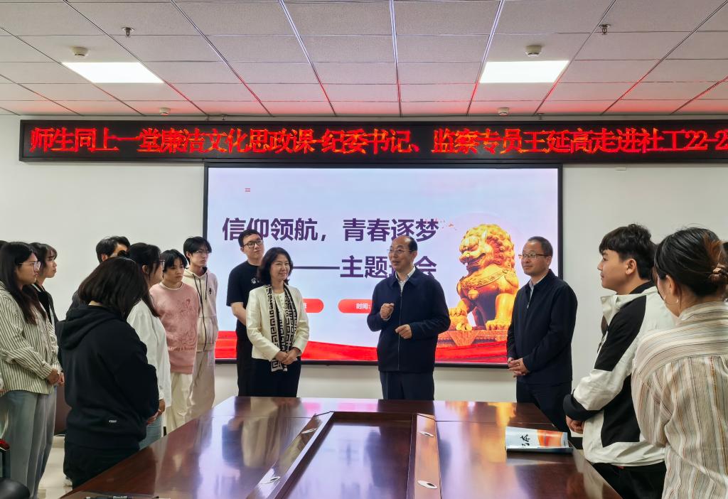 在全校上下扎实开展深入贯彻中央八项规定精神学习教育之际,为推动思想政治教育入脑入心入行,5月13日下午,纪委书记、监察专员王延高走进联系班级——人文社会科学学院社会工作专业2022级2班,参加“信仰引领 青春逐梦”主题班会。
