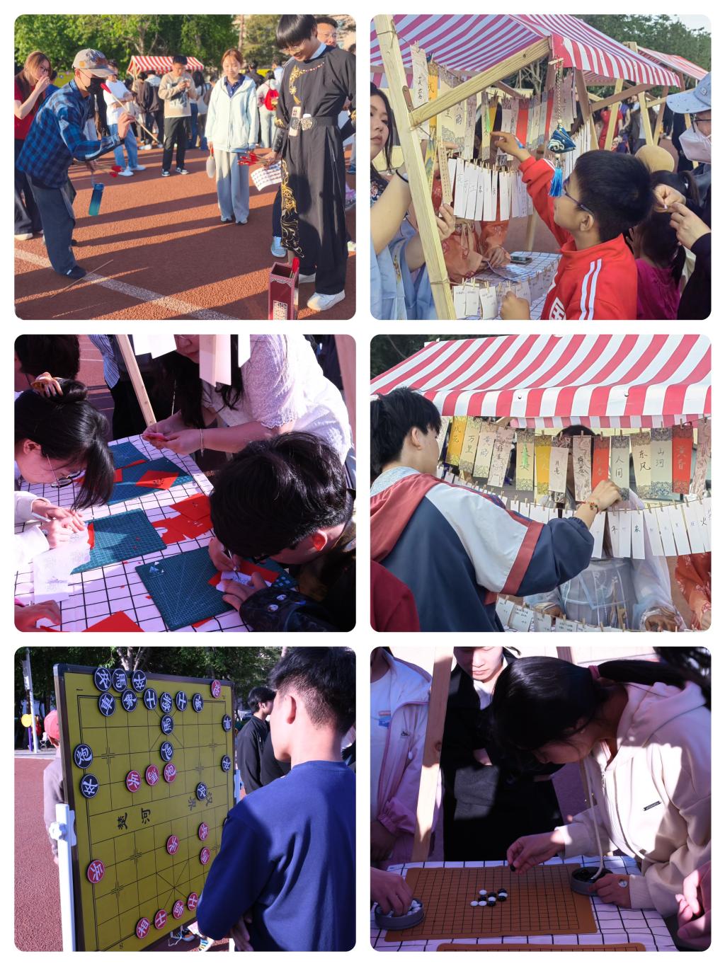 活动现场设置了“猜字谜”“飞花令”“好运投壶”“棋艺对弈”“软笔书法”“剪纸”等八大传统游戏体验摊位,同学们沉浸式打卡妙趣横生。在“解字藏情”字谜区,同学们凝神思索藏于谜面中的端午元素,成功解谜后收获满满成就感;在“吟句咏粽”飞花令环节,诗词爱好者们以“粽”“端午”为引,展开激烈诗词PK;投壶区的欢呼声更是此起彼伏,同学们手持箭矢,复刻古人游戏乐趣;书法与剪纸摊位前,墨香与纸艺交织,学生们用笔墨书写端午祝福,以剪刀裁剪传统纹样,在实践中感受传统文化魅力。