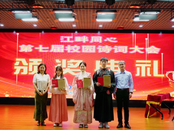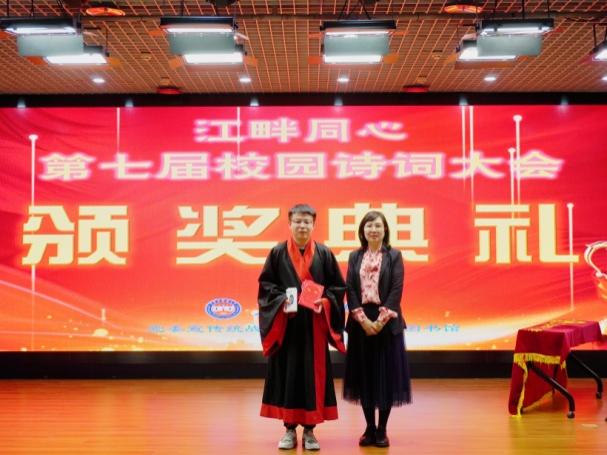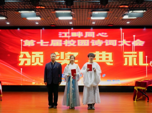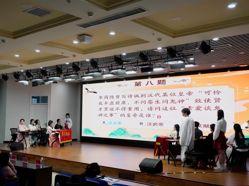 为赓续中华文脉、厚植文化底蕴,深化营造书香校园诗意氛围,引领广大师生品读古典韵律、体悟千年哲思,5月29日晚,由党委宣传统战部、校团委、图书馆联合主办的“江畔同心”第七届校园诗词大会决赛在朝阳楼报告厅璀璨启幕。党委宣传统战部副部长吴维华,校团委副书记马紫微,图书馆馆长郭明良、副馆长李强出席了当晚决赛。人文社会科学学院曹景萍教授、李璐副教授担任点评嘉宾。本场决赛由吴南主持,来自图书馆和各学院的百余名师生共同观看了这场诗词盛会。