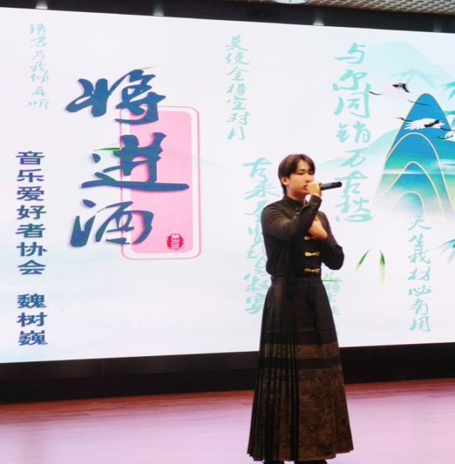中场环节,音乐爱好者协会魏树巍演绎的歌曲《将进酒》唱出了诗仙李白“谪仙人”的风骨与神韵,使得这首千古名篇在当代舞台上焕发出新的生命力与感染力,这也是对中华优秀诗词文化的一次深情礼赞与创新传承;观众互动环节更将气氛推向高潮,观众们争先恐后地回答问题,也凭实力捧走诗词盲盒奖品。这些环节为大赛增添了色彩,使观众领略了不同的传统文化魅力,更激发了现场同学们对中华诗词的热爱之情。
