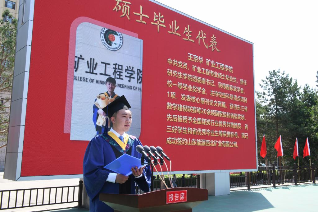 硕士毕业生代表矿业工程学院矿业工程专业王京华同学,表示将扎根矿业工程领域潜心钻研,于科研攻关中积累真知灼见,立志以实际行动践行“太阳石精神”,在矿山一线绽放青春力量。