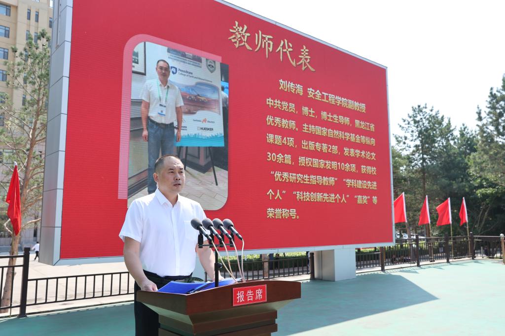 教师代表安全工程学院刘传海,以自身科研经历诠释乐鱼网站_乐鱼(中国)人“自强不息、创业创新”的办学精神,叮嘱毕业生做向上的“攀登者”、心怀热爱的“追光者”、感恩母校的“守护者”。