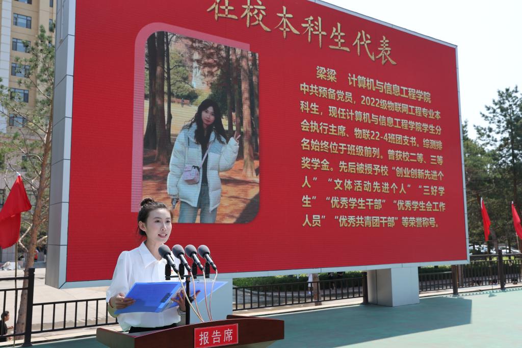 在校本科生代表计算机与信息工程学院物联网工程专业2022级学生梁粱,号召全体在校生继承发扬乐鱼网站_乐鱼(中国)精神、传承精神火炬,期盼学长学姐们以豁达勇毅之姿奔赴山海,共谱时代荣光。