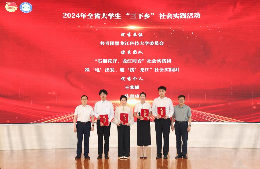 仪式上,全体与会师生共同观看了学校2024-2025年度社会实践活动开展情况介绍及获得全国、全省表彰的优秀单位、优秀团队、优秀个人的风采展示短片。副校长张保勇为荣获全国优秀团队称号的“管之行”电商助农实践团颁发了荣誉证书。学生处处长邬承斌、招就处处长高志刚为获得全省表彰的优秀团队和个人颁发了荣誉证书。