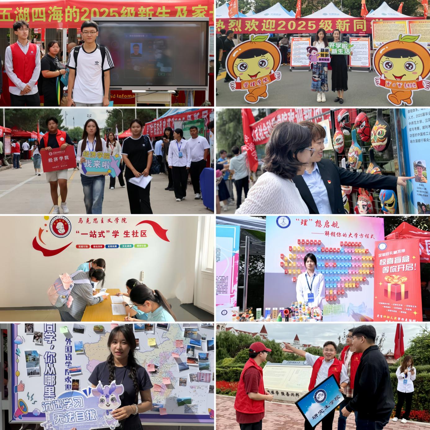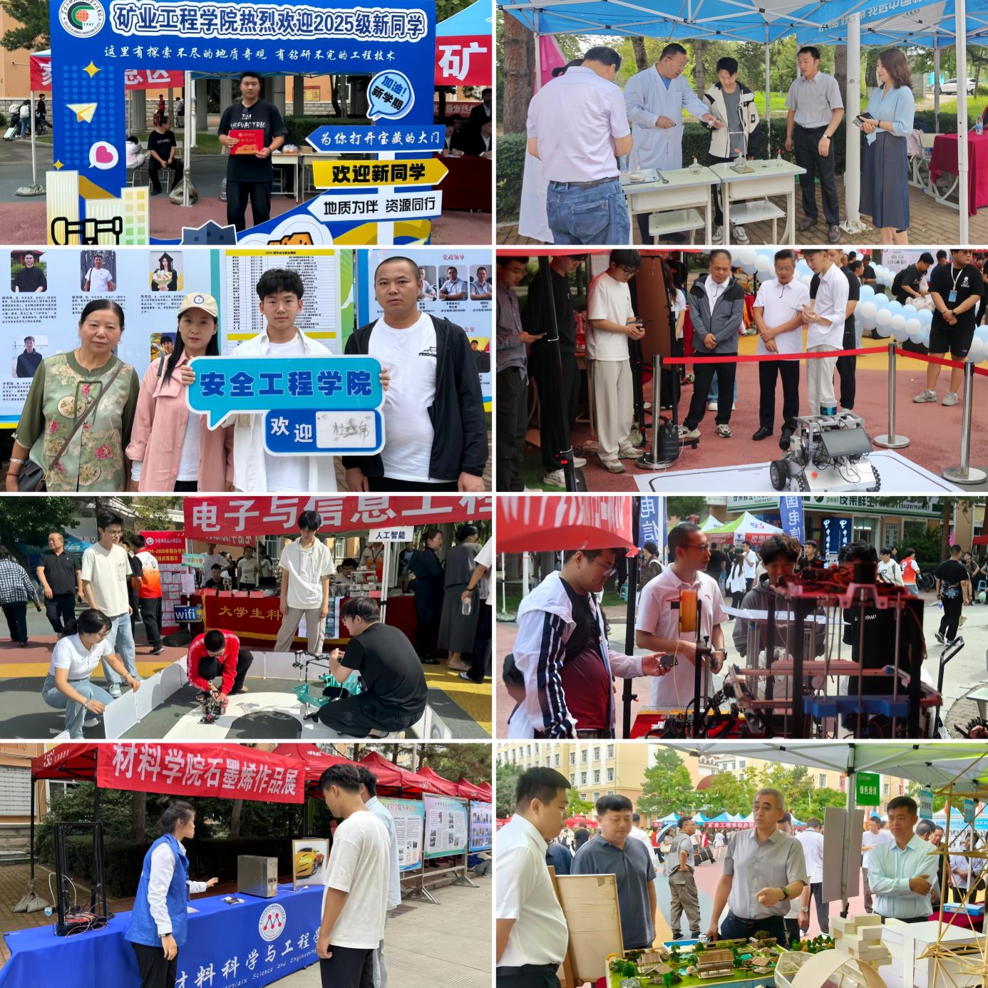 彰显学院特色,以“样样突出亮点”的创新丰富入学体验。各学院精心布置迎新现场,充分展示专业魅力,激发新生对未来学习生活的信心。矿业学院设置矿业主题打卡墙,以视觉化设计直观呈现专业特色,助力新生快速建立专业认同感;环化学院策划“趣味化学实验秀”,引导新生近距离感受化学奇妙,激发学习热情;安全学院在报到台设置“安全启航 挺膺担当”拍照打卡点,新生与家长共同手持可签名KT板,一起留下珍贵的入学纪念照;电气学院倡导新生“带着作品来报到”,举办新生科技创新作品展示,深化新生专业认知,点燃学术兴趣;电信学院举办“智启新程,创新未来”科技体验活动,为新生提供互动体验,创造学术沃土;机械学院通过展示精密机械作品,直观彰显学科核心优势,帮助新生建立对专业的清晰认知;材料学院设置“石墨烯作品”展台,展示获奖成果,营造浓厚科技创新氛围;建工学院集中展示本院各类竞赛获奖作品,涵盖结构精巧的建筑模型与设计新颖的工程图纸,启迪新生思考学业规划与职业愿景;计算机学院“智”能助力迎新,依托研究生带领本科生开发的“2025级新生报到管理平台”,实时展示报到进度、生源结构等信息,方便新生及家长查询;管理学院设置学院吉祥物“管橙诚”卡通形象互动区、梦想邮局及主题拍照打卡点,邀请新生写下致未来自己的一封信,封存初心待毕业启封,见证成长轨迹;经济学院组织“学长学姐带你沉浸式游校园”活动,帮助新生快速熟悉环境、感受校园文化;人文学院设置美育展示墙,让新生在观赏中触摸历史、感受文化底蕴,厚植文化认同;马克思学院为新生准备倾“新”“暖心包”,提前装入一卡通、入住单、体检单等物资,以细节传递关怀;理学院设置“惊喜盲盒”,让新生在开启时感受学院专属暖意,快速建立归属感;外国语学院创新设计“你从哪里来”多模态迎新展板,鼓励学生用英文讲述家乡故事、进行风采录制与实物展示,搭建交流“破冰”平台;研究生学院强化引导效率,组建“校门引导组”“报到登记组”“公寓向导组”,高效引导新生完成入校至入住全流程。