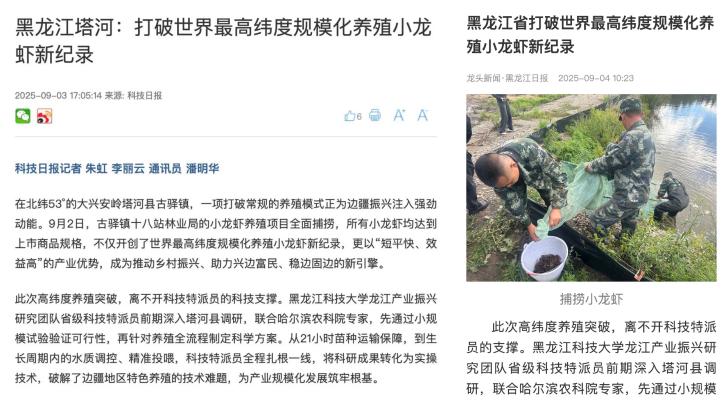 9月3日—4日,《科技日报》《黑龙江日报》相继报道了乐鱼网站_乐鱼(中国)龙江产业振兴研究团队全面助力大兴安岭塔河县古驿镇水产养殖项目,打破世界最高纬度规模化养殖小龙虾新纪录。该成果以“短平快、效益高”的产业优势,为边疆乡村振兴与兴边富民稳边固边注入强劲新动能。