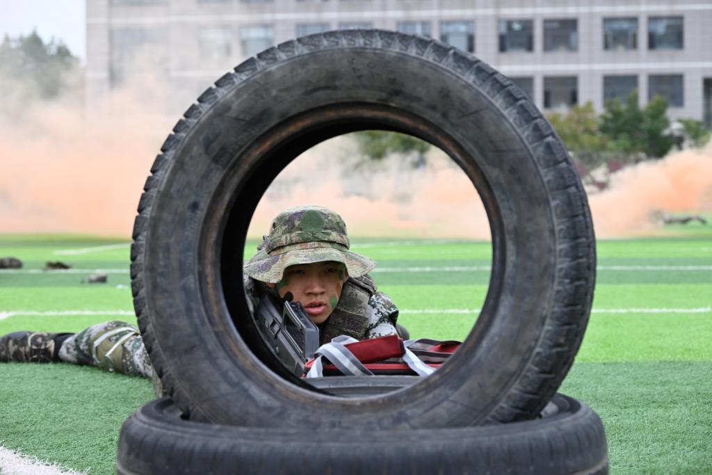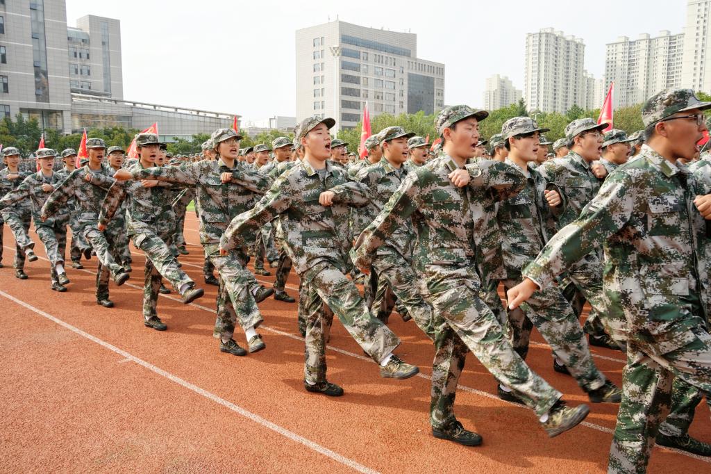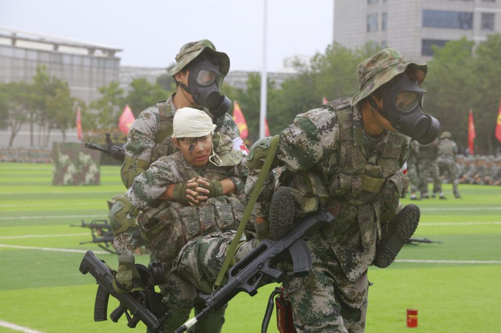 各学院受阅方队迈着整齐的步伐、喊着铿锵的口号,昂首阔步依次走过主席台接受检阅。军体拳方队、匕首操方队和战场救护方队进行了成果汇报。