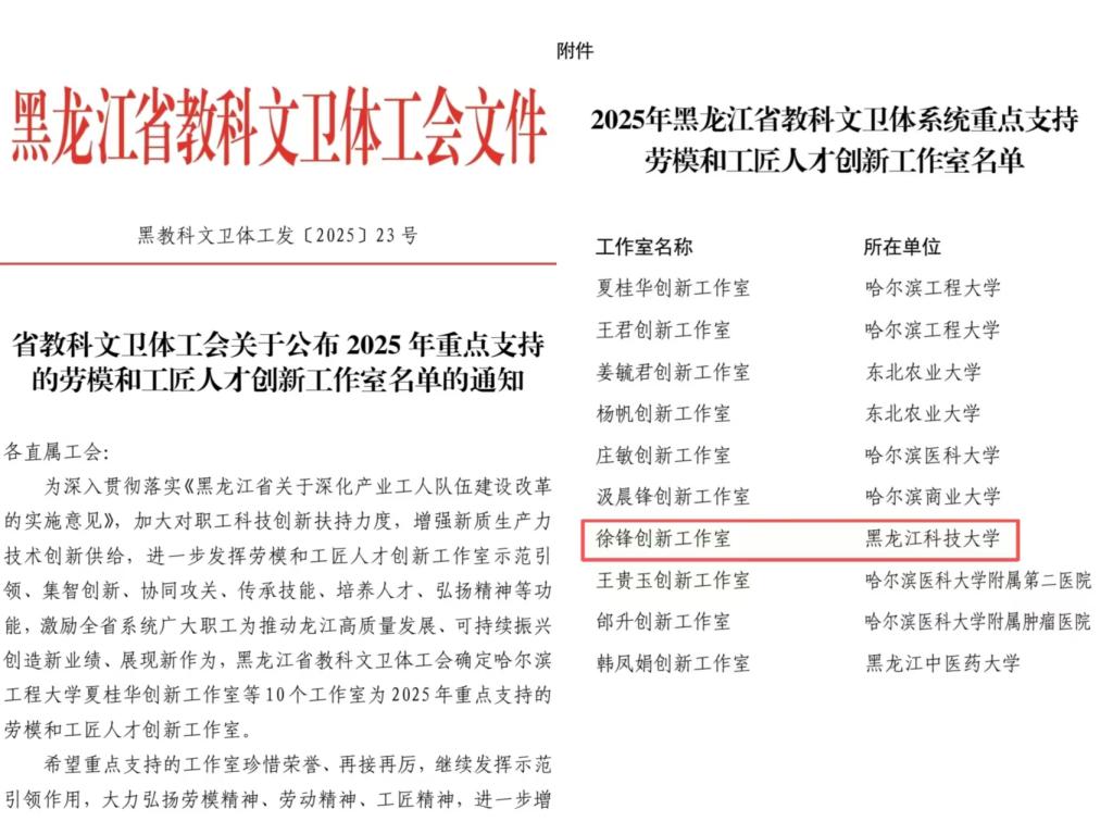 近日,黑龙江省教科文卫体工会委员会下发通知,乐鱼网站_乐鱼(中国)徐锋创新工作室被省教科文卫体工会确定为2025年重点支持的劳模和工匠人才创新工作室。