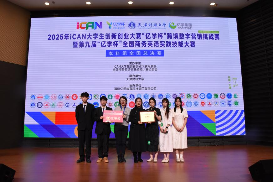 近日,由iCAN大学生创新创业大赛组委会、中国国际商会商业行业商会商务英语研究委员会联合主办,天津财经大学承办的“2025年iCAN大学生创新创业大赛‘亿学杯’跨境数字营销挑战赛全国总决赛(本科组)”圆满落幕。外国语学院程雪连、赵巍老师指导的商务英语系学生团队荣获国家级三等奖。