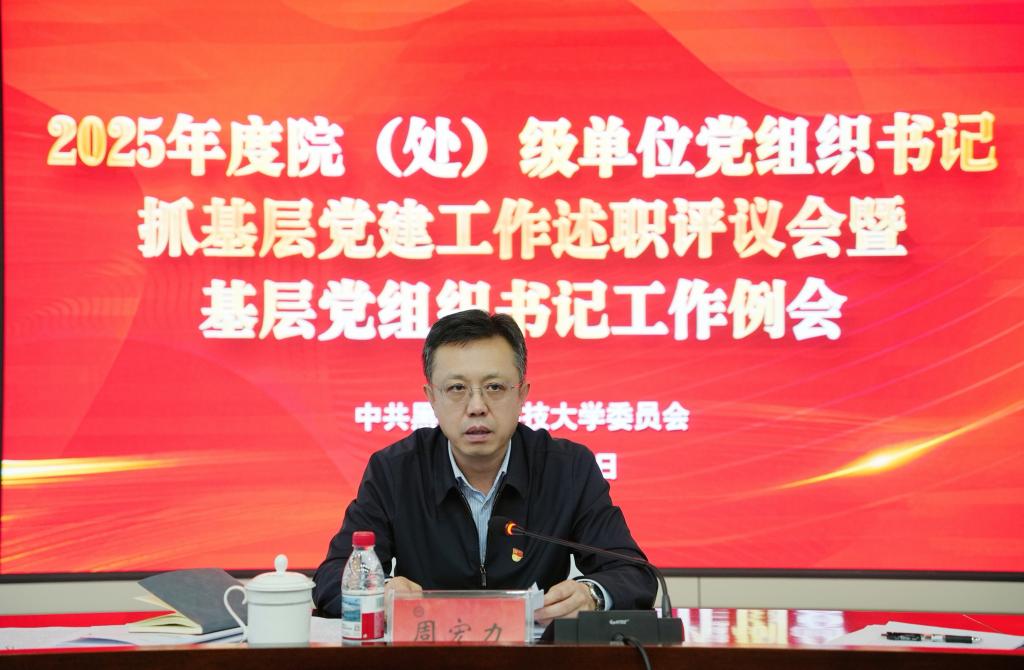 为进一步夯实基层党建工作基础,压实基层党建工作责任,推进全面从严治党向基层延伸,推动学校党建工作提质增效,按照省委教育工委部署要求,12月30日下午,学校在办公楼6004会议室召开2025年度院(处)级单位党组织书记抓基层党建工作述职评议会暨基层党组织书记工作例会。学校党委领导班子成员,学校党委委员、纪委委员,院(处)级单位党组织书记,党群部门负责人和基层党员干部群众代表参加了会议。会议由校党委书记周宏力主持。