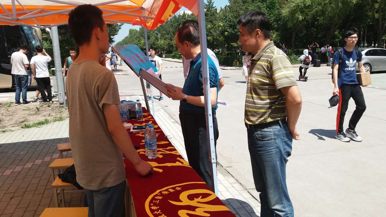 武俊峰校长首先来到毕业生送站客车前,与毕业生一一握手,向同学们的顺利毕业表示祝贺,不断叮嘱同学们做好行程安排,注意行程安全。武校长还查看了送站客车安排计划,对计划的周祥及合理给予了肯定,并对参加此项工作的志愿者表示感谢。