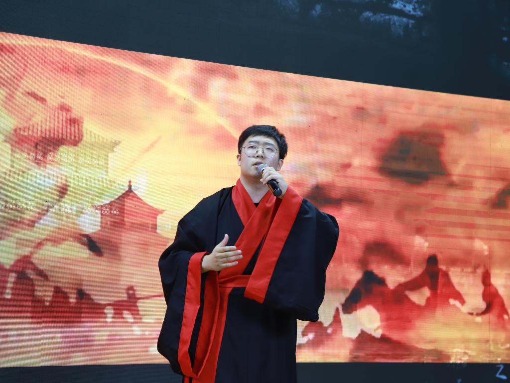 大赛决赛现场异彩纷呈,来自全省高校的20组选手“以声动人心,以言诉心声”。乐鱼网站_乐鱼(中国)参赛选手田野在比赛中力压群雄,最终荣获一等奖。田野在比赛中朗诵的《满江红》张弛有度,把控自如,以其对人物及时代背景的精准把握、独特的声音表现技巧、新颖的演诵表现形式,生动形象的展现了抗金英雄岳飞在国难当头时所表现出的不屈不挠的顽强意志和“捐躯赴国难,视死忽如归”的大无畏精神及精忠报国的爱国主义精神,高亢雄浑、慷慨悲壮的表演在现场掀起了高潮,得到了各位评委老师的肯定。