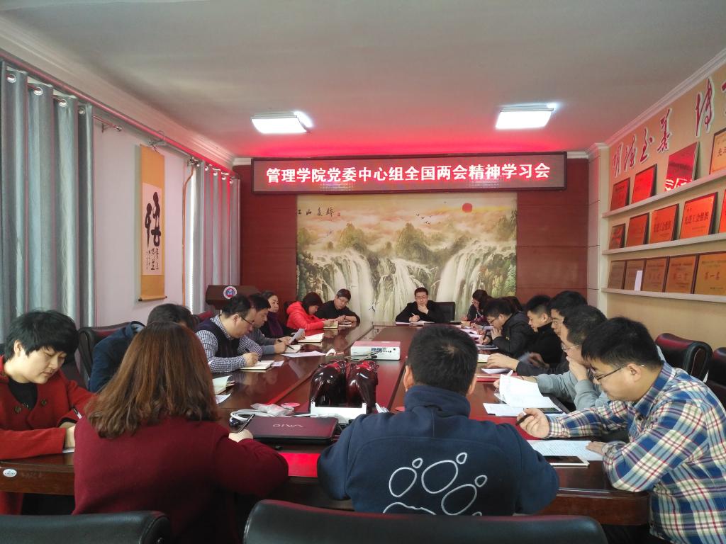3月23日,管理学院党委召开党委理论中心组扩大会议,学习贯彻全国“两会”精神。会上,学院党委书记王洪秋领学了习近平同志在十三届全国人大一次会议闭幕式上的讲话、人民日报社论《肩负新使命,迈向新征程——热烈祝贺十三届全国人大一次会议胜利闭幕》、《画好同心圆,筑梦新时代——热烈祝贺全国政协十三届一次会议胜利闭幕》、《国家的掌舵者,人民的引路人》。与会人员结合各自岗位工作就如何学习贯彻全国“两会”精神进行了学习研讨。(马颖/文)