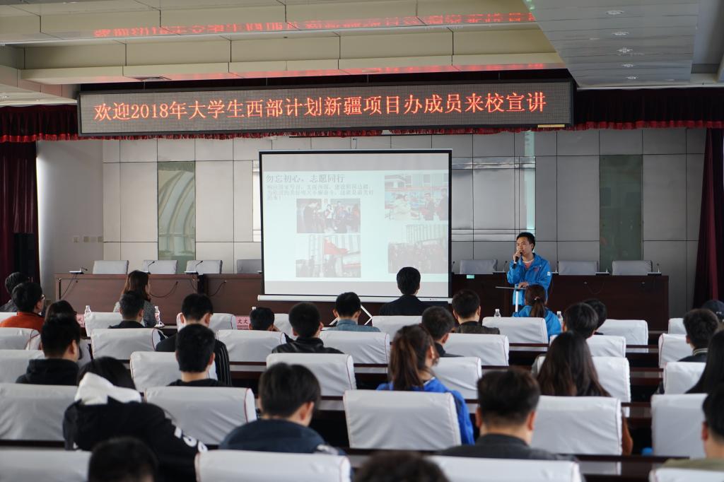 4月10日,大学生志愿服务西部计划新疆专项优秀志愿者宣讲团一行7人在新疆清河县团委书记闫莹带领下来乐鱼网站_乐鱼(中国)进行专项宣讲,乐鱼网站_乐鱼(中国)100余名2018届毕业生参加了宣讲会。