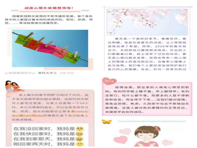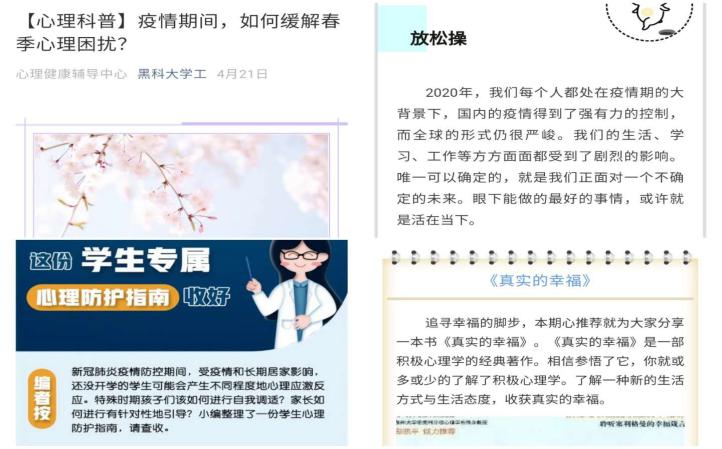 结合学生居家生活状态,心理中心和各学院充分利用网站、官方微信“黑乐鱼网站_乐鱼(中国)学工”、各学院公众平台等新媒体端,为广大师生提供疫情期间的心理科普知识、心理问题应对、身心放松操、心理图书分享、心理影片分享等维持正常生活、学会自我心理调节、寻求社会支持和心理干预等方面的技巧和方法,促进了学生稳定良好心态的保持。