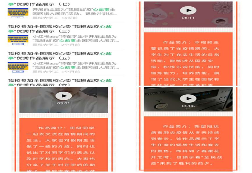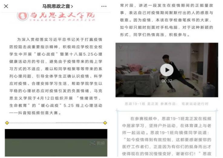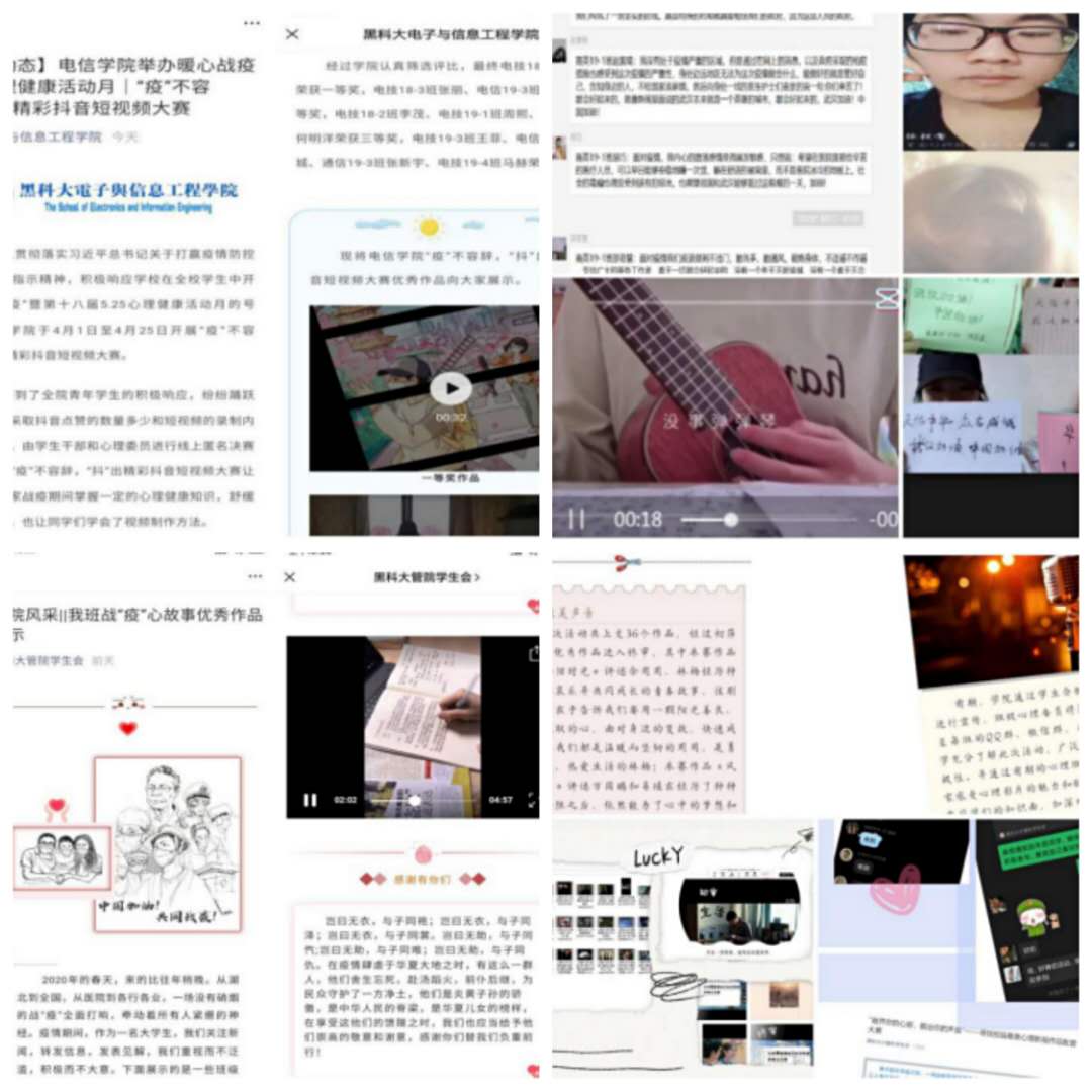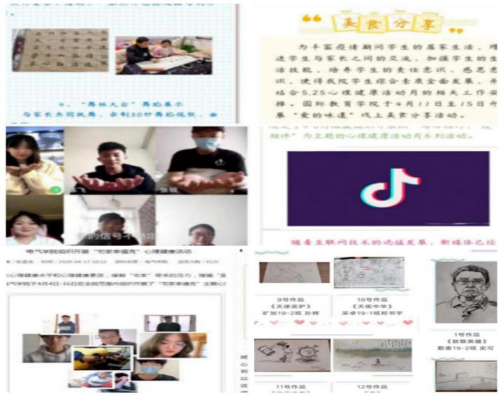 疫情防控期间,组织丰富多彩的活动,有效帮助学生缓解、释放不良情绪,提升学生应对困难挑战的能力和信心。心理中心以及全校16个学院也纷纷开展各具特色的主题教育活动,以“读书分享会”“线上团体辅导”“线上厨艺大比拼”“绘画大赛”“心理影视作品配音大赛”“抖音视频大赛”等活动形式,通过文化作品作品、美食分享、“宅家时光”视频分享、幸福时刻“SHOW”等活动内容,将疫情防控、心理减压、积极心态建立、家校合作等方面的知识寓教于乐,让学生们感受云端互动的新奇和喜悦,感受团队合作带来的支持和温暖。作为理事单位,心理中心组织参加了中国心理学会及高校心理委员工作平台联合举办的“我班战疫心故事”全国网络大展示活动,全校共有58个作品参加,得到活动主办方的高度认可。