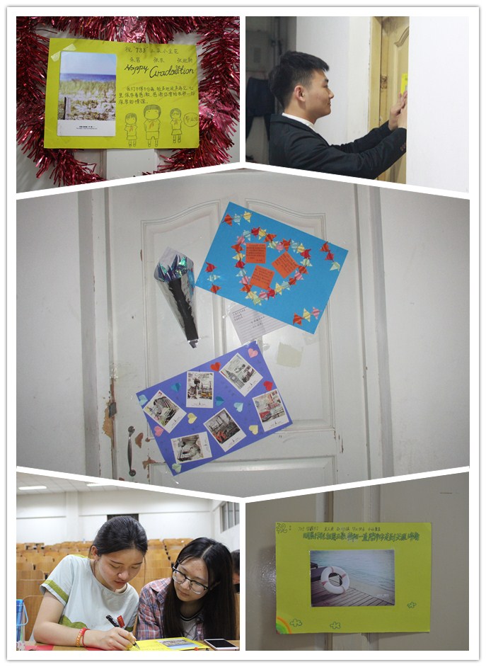 21日凌晨00:40,第九学生公寓。在此时在校生将写满祝福的留言本、精心制作的千纸鹤、美好回忆的照片、手工制作的拉花、香甜的大白兔……贴满了外国语学院每一个2017届毕业生的寝室,这是一种祝福,更是一种传承,在校生用他们的行动为毕业生送上最真挚的情谊。