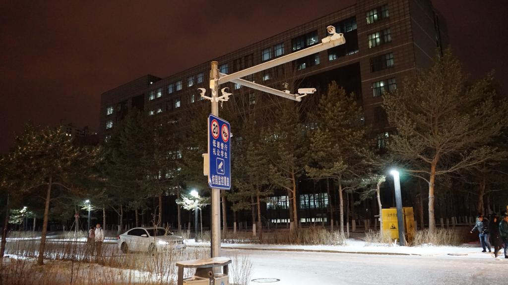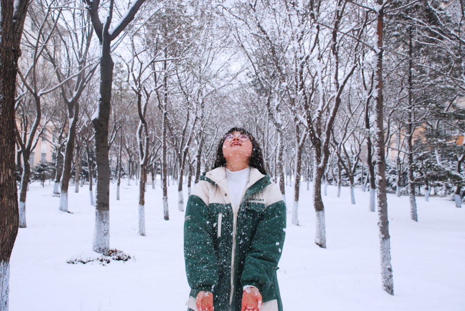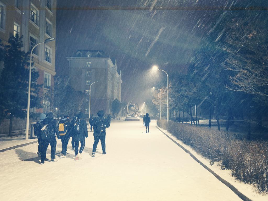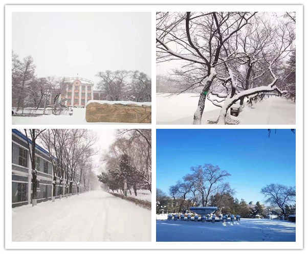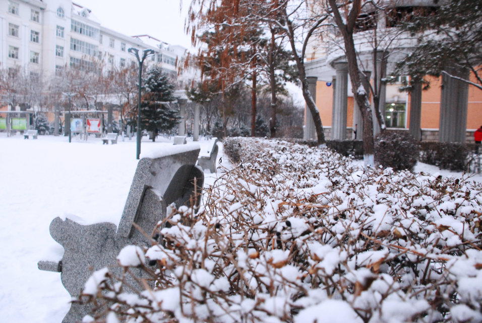 大雪与校园不期而遇,道路两旁的树木,被薄雪染白了双鬓,更显冬天特有的活力。