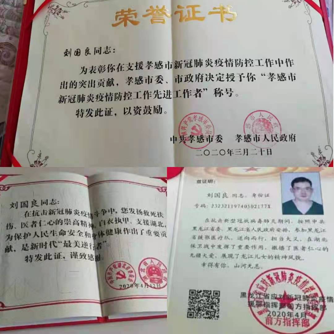 刘国良简介:中共党员,海伦市中医医院麻醉科主任,2020年2月作为黑龙江省第三批援鄂医疗队成员支援湖北省孝感市,曾被湖北省委、省政府授予“新时代最美逆行者”称号;被孝感市委、市政府授予“孝感市新冠肺炎疫情防控工作先进工作者”称号;被汉川市委、市政府授予“新时代最可爱的人”称号。
