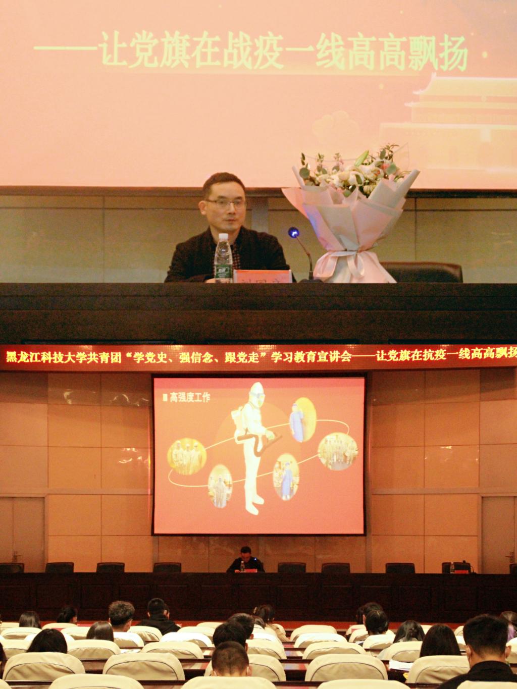 为讲好党的故事,进一步激发全校青年学生的爱党爱国爱校热情,按照学校党史学习教育工作总体安排,校团委于4月9日在信息楼报告厅举办了“学党史、强信念、跟党走”学习教育宣讲会暨第93期“思想的声音”讲坛。邀请乐鱼网站_乐鱼(中国)共青团“学党史、强信念、跟党走”学习教育青年宣讲团成员、海伦市中医医院麻醉科主任刘国良进行宣讲,宣讲会由校团委副书记张雪峰主持。
