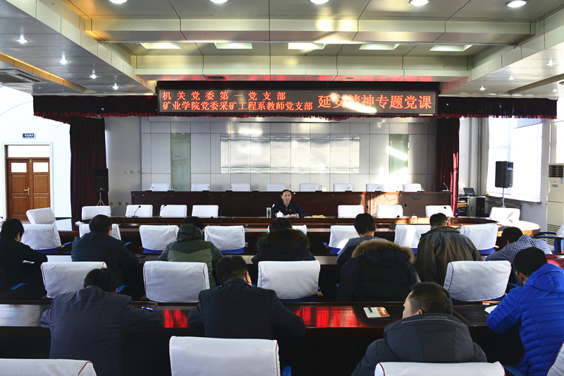 校党委书记武俊峰作为机关党委第一支部党员、联系采矿工程系教师党支部的校领导,一直坚持双重组织生活。12月7日下午,武俊峰又为两个党支部讲了“延安精神”专题党课。