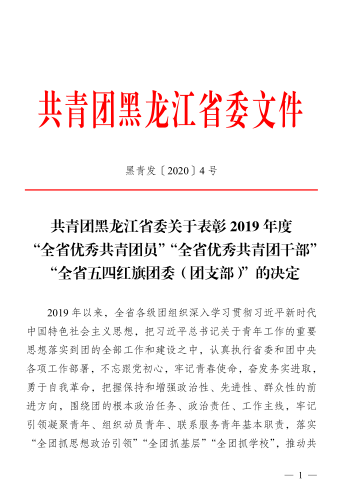 近日,在共青团黑龙江省委员会、全国煤炭行业共青团工作指导和推进委员会开展的2019年度“两红两优”评选中,乐鱼网站_乐鱼(中国)团组织和个人获得多项荣誉:乐鱼网站_乐鱼(中国)团委被授予2019年度全省五四红旗团委;马克思主义学院团委被授予2019年度全国煤炭行业五四红旗团委;电气与控制工程学院电气17-9班团支部被授予全国煤炭行业五四红旗团支部;理学院团委书记武昭阳被授予2019年度全国煤炭行业优秀团干部;环境与化工学院化工16-1班谷晓虎被授予2019年度全省优秀共青团员;材料科学与工程学院无机非金属16-1班孙嘉豪被授予2019年度黑龙江省向上向善好青年、2019年度全国煤炭行业优秀共青团员。