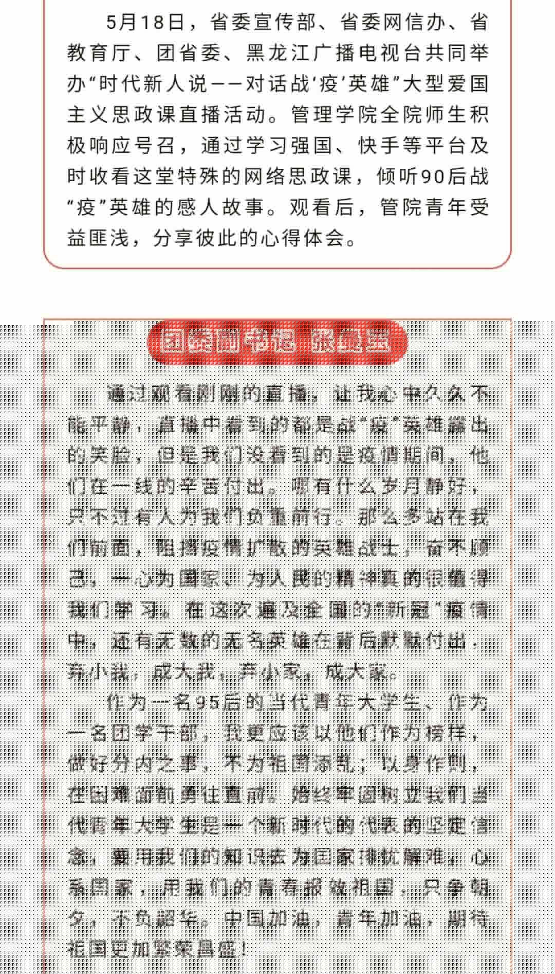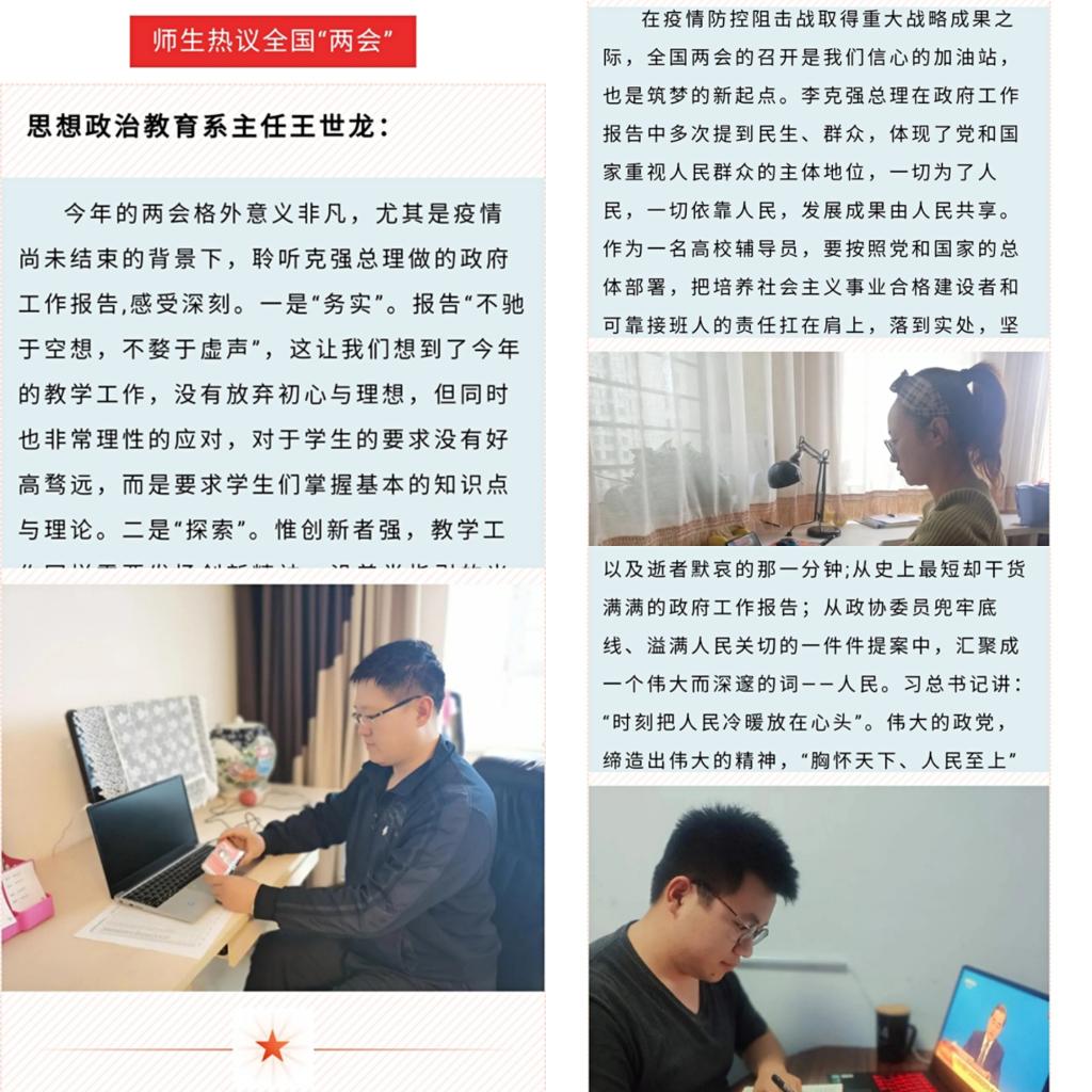 网络思政守初心。为加强青年学生思想引领和价值引领,校团委通过官方微信、网站持续推出8期“微团课”,结合工作实际和重要时间节点,充分发挥网络思想政治教育效能;管理学院举办“时代新人说——对话战‘疫’英雄”大型爱国主义思政课,通过学习强国、快手等平台及时收看这堂特殊的网络思政课,倾听90后战“疫”英雄的感人故事,同学们受益匪浅,分享彼此的心得体会;马克思学院开展“不忘思政初心——线上收看新闻联播”、“聚焦热点 关注两会”等活动,帮助同学们切实关注时事动态,通过组织统一收看新闻联播活动,提高思政学子的思想政治觉悟,深刻体会中国共产党的“能”、马克思主义的“行”和中国特色社会主义制度的“好”,激发乐鱼网站_乐鱼(中国)学子的责任与担当。