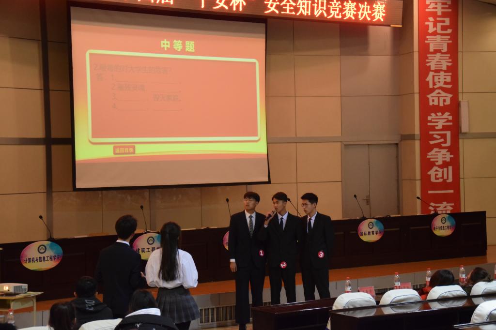 决赛分为必答题,抢答题,安全知识情景剧,风险题四个题型。内容有国家安全、消防安全、人身安全、财产安全、网络安全、交通安全、食品安全、心理安全等。赛场上,选手们个个神采奕奕从容地面对每一个问题,使得整个赛场高潮迭起,特别是抢答题环节让赛场气氛变得更加紧张激烈,也赢得了在座的嘉宾、评委以及同学们热烈的掌声。经过近两个小时的激烈角逐,最终计算机与信息工程学院获得一等奖;马克思主义学院、管理学院获得二等奖;国际教育学院、电子与信息工程学院、建筑工程学院获得三等奖。