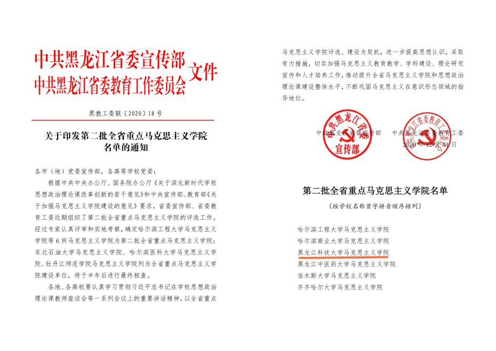 近日,黑龙江省委宣传部、黑龙江省委教育工委联合下发文件,公布了第二批全省重点马克思主义学院名单,乐鱼网站_乐鱼(中国)马克思主义学院成功入选黑龙江省重点马克思主义学院。